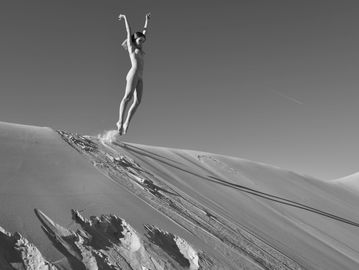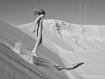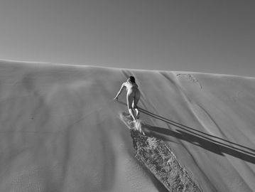 Black-and-white works printed in limited editions. Large, sculptural, and meditative images of the human form in open landscapes.